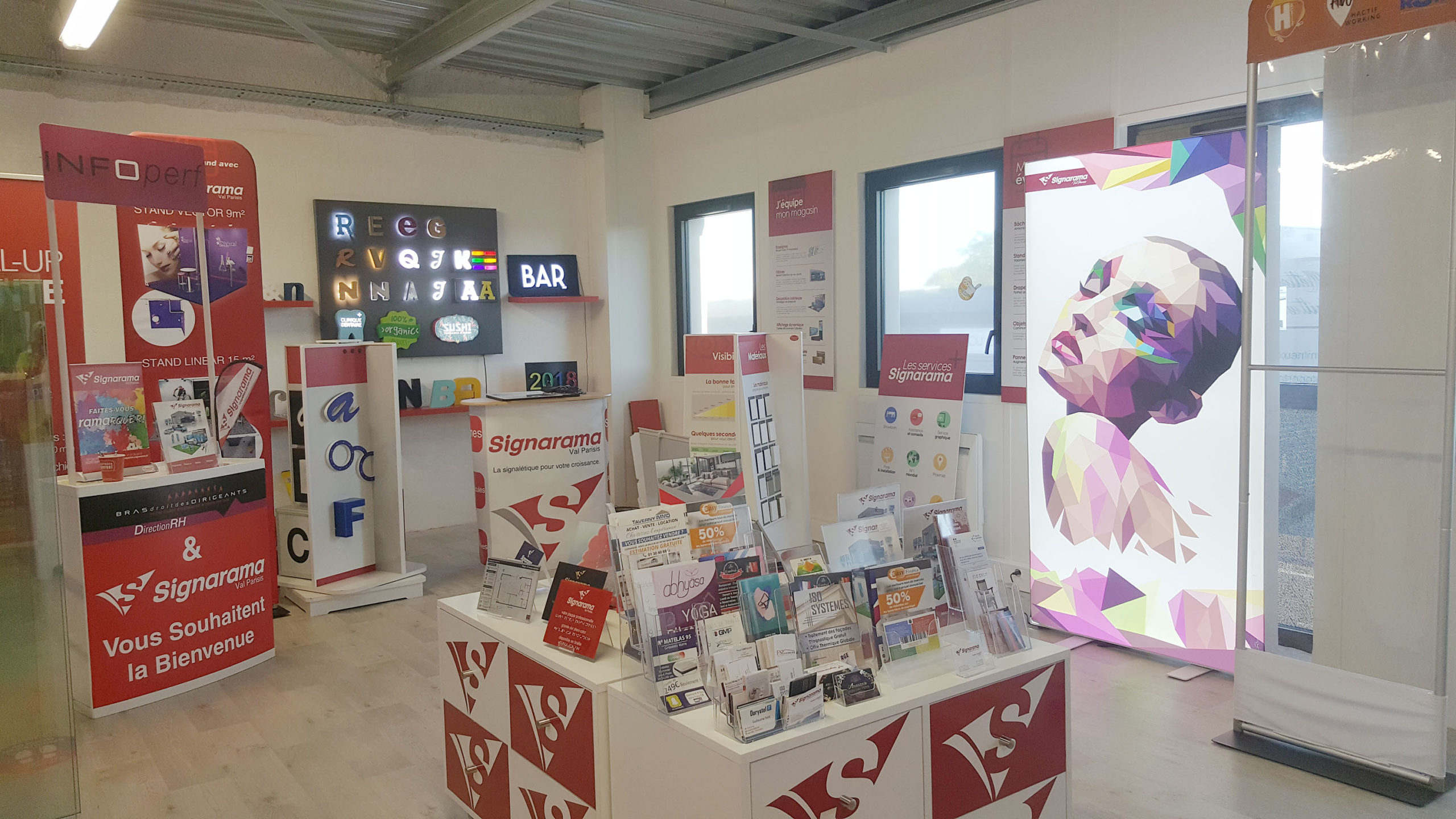 Le concept Signarama propose l’ensemble des produits et techniques de la communication de proximité, c’est-à-dire tout ce qui permet d’être vu et reconnu, à une clientèle B to B, en un seul point de vente, visible et accessible,